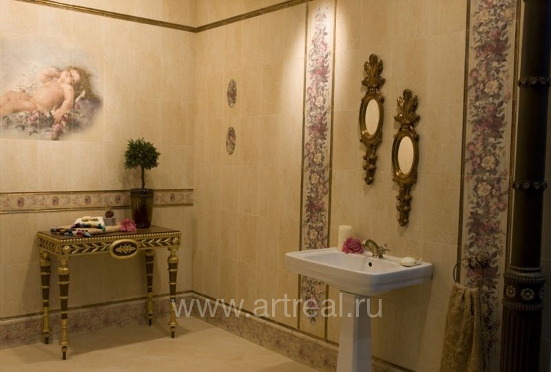 Изысканная коллекция «мраморной» плитки для ванной в классическом стиле Halcon San Angelo включает большое панно площадью почти 1м2. Сюжет панно напоминает картину эпохи Возрождения, а его фрагменты повторяются в рисунке на бордюрах.