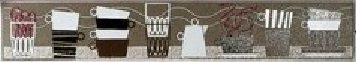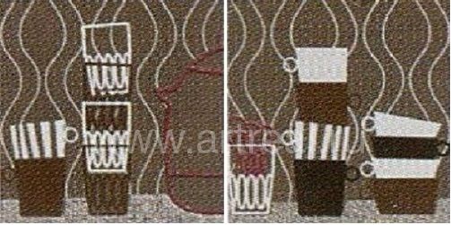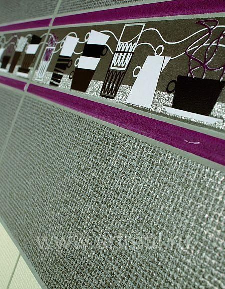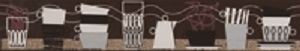 Настенная плитка имеет несколько цветов: коричневый, белый, светло-серый и бежевый. На бордюре и маленькой плитке изображены живописные чашки (размеры 5х30 см и 10х10 см).