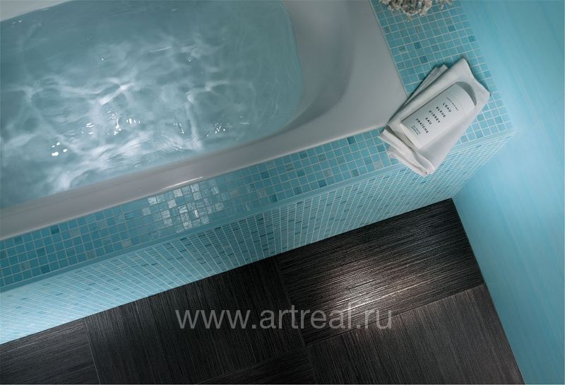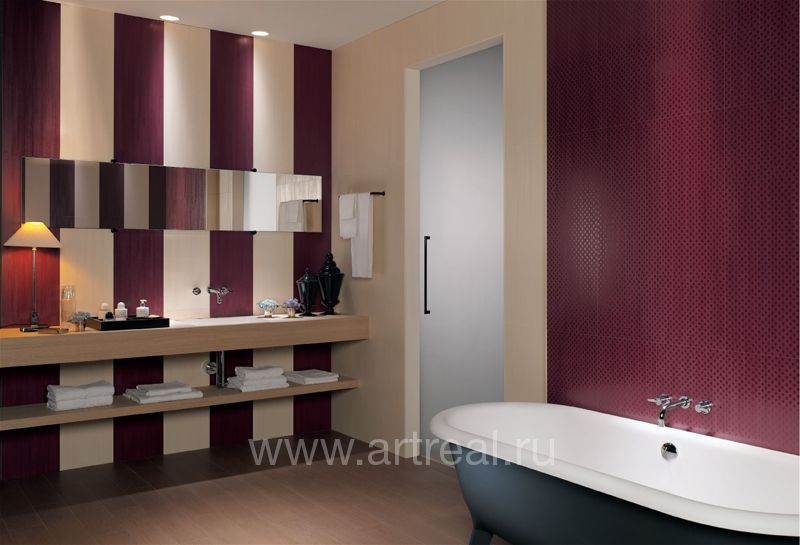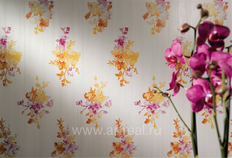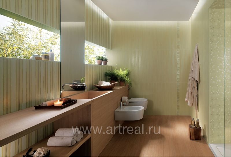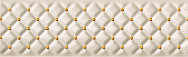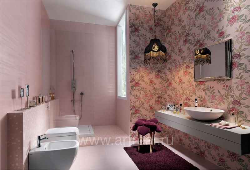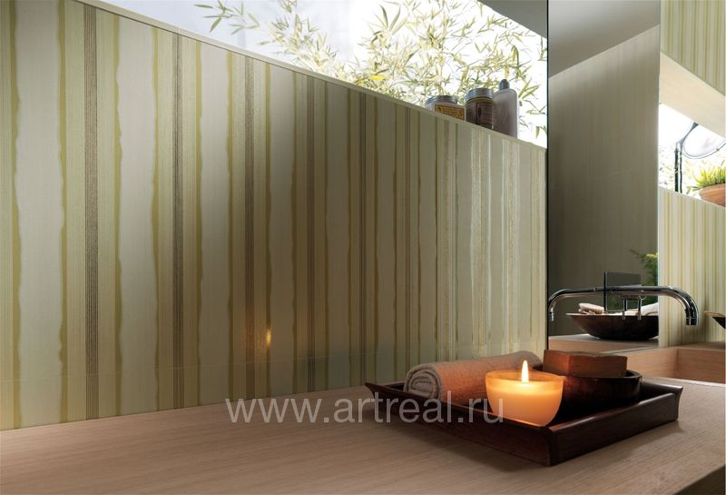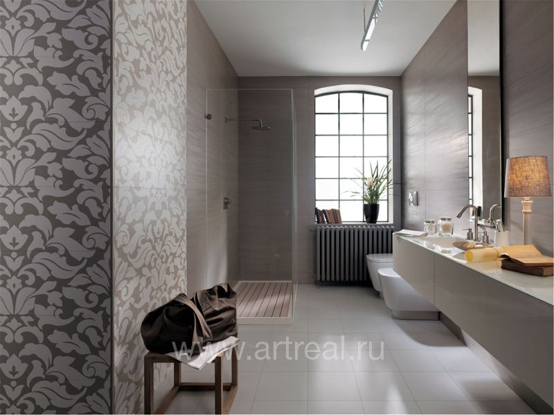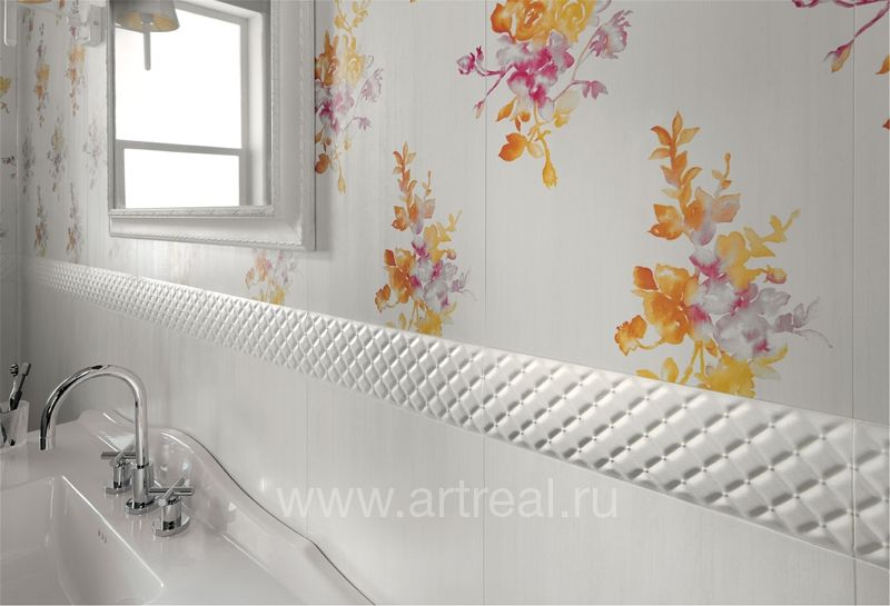 Фоновая плитка имеет небольшое сатинирование и является ректифицированной. Ее удачно дополняют несколько различных вариантов декоративных элементов. Во-первых, это плитки, на которых находится изображение стилизованных букетов цветов. Для отделения их от однотонных плиток могут использоваться широкие бордюры, на которых находится диагональный объемный рисунок.