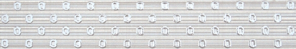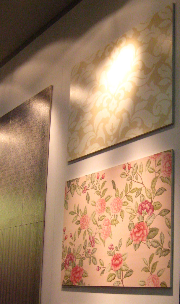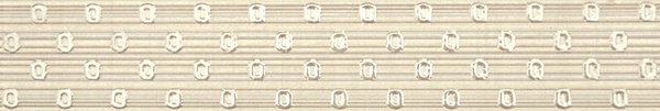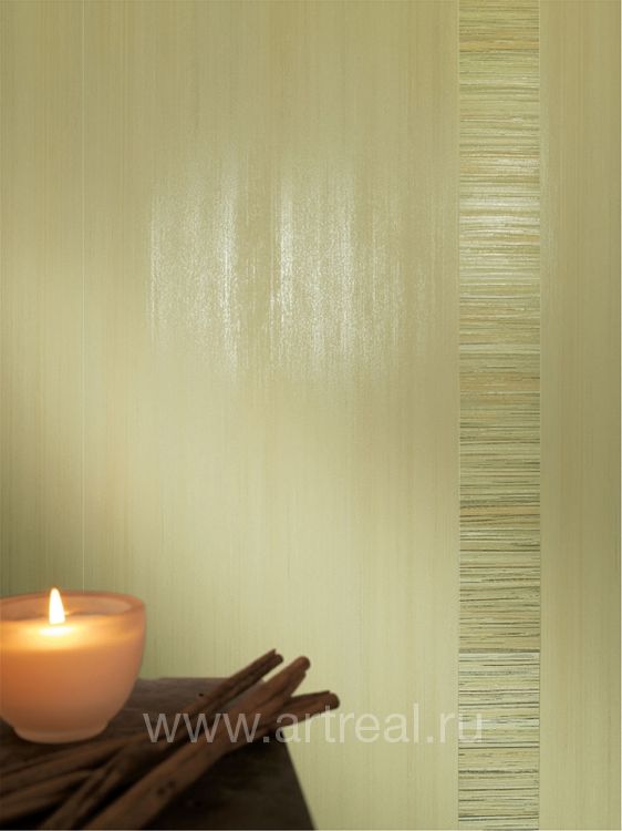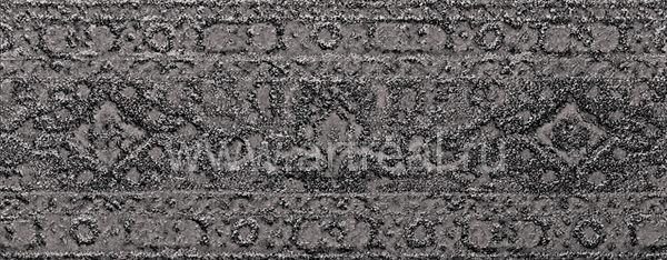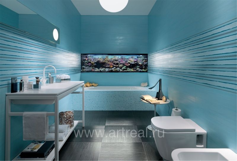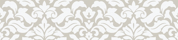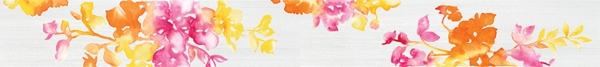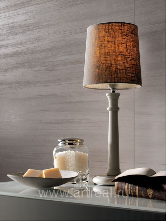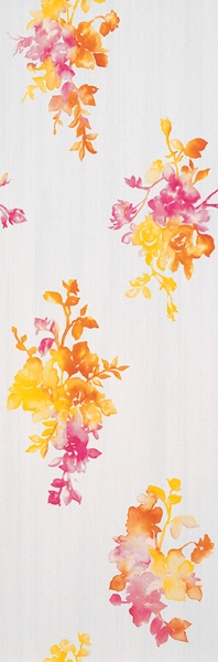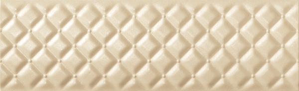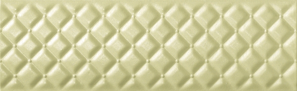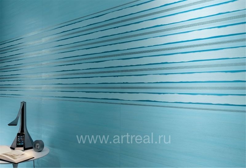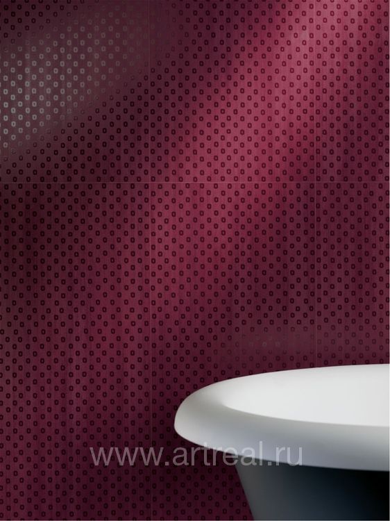 Фоновая плитка имеет небольшое сатинирование и является ректифицированной. Ее удачно дополняют несколько различных вариантов декоративных элементов. Во-первых, это плитки, на которых находится изображение стилизованных букетов цветов. Для отделения их от однотонных плиток могут использоваться широкие бордюры, на которых находится диагональный объемный рисунок.