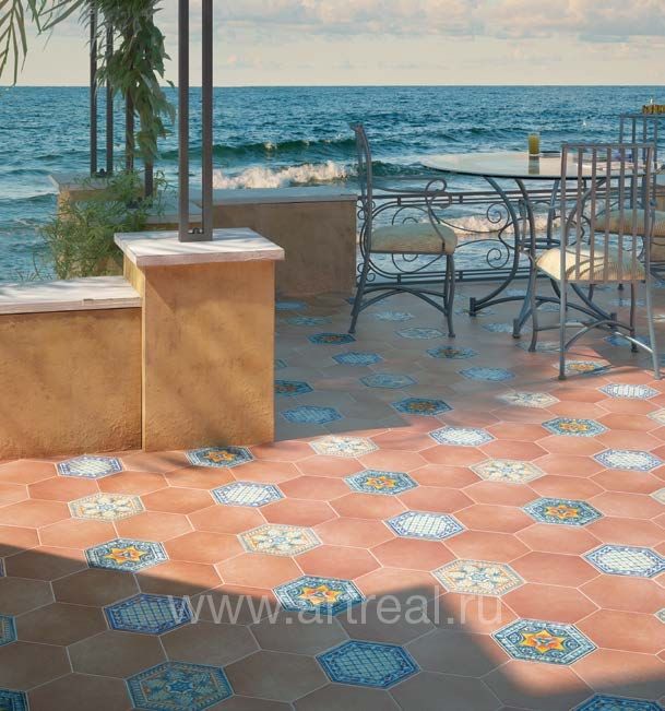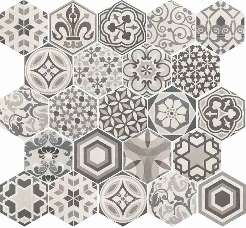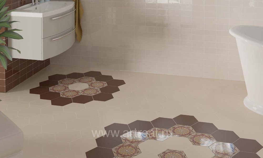 Вся плитка и декор выпущены в едином формате 17.5×20 и легко комбинируются между собой. При желании, плитку Hexatile можно использовать как отделку не только пола, но и стен.