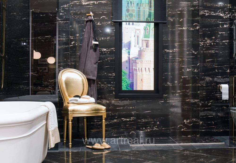 Коллекция керамической плитки Porcelanosa PortBlack — это эффектная стилизация под черный мрамор. Глубокий цвет подчеркивают белые вкрапления, имитирующие окрас натурального камня.